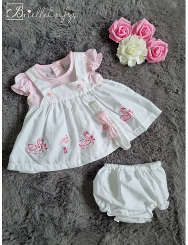 Button fastened at the front and decorated with little swans towards the hem. This comes as a 3 piece set which also includes the elasticated headband and matching pants.
